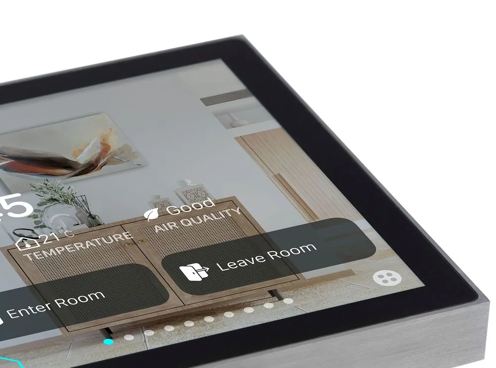 Un pannello di controllo digitale che sostituisce tutti i dispositivi di comando a parete. Con un design sottile di soli 11 mm di spessore, offre un'interfaccia utente intuitiva per gestire tutti i dispositivi della stanza.