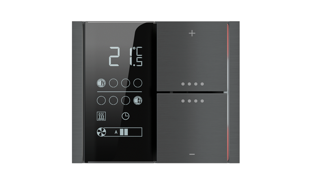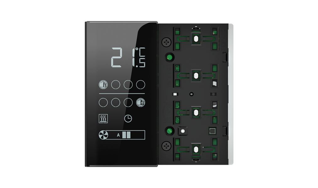 Il termostato ambiente Ekinex® serie FF serve alla regolazione indipendente della temperatura di un ambiente o una zona. In combinazione con uno o più attuatori KNX, il termostato è in grado di controllare l’emissione di caldo o freddo di una serie di terminali per lo scambio termico in ambiente (come radiatori, ventilconvettori, pannelli radianti a pavimento e soffitto, ecc.). Il dispositivo è equipaggiato con un display LCD a retroilluminazione regolabile, un sensore per il rilievo della temperatura in ambiente e due ingressi liberamente configurabili. I LED di segnalazione possono essere a scelta nelle combinazioni di colori blu/verde o bianco/rosso. Il dispositivo dispone di un modulo di comunicazione bus KNX integrato ed è realizzato per montaggio in scatola da incasso a parete; è alimentato per mezzo del bus KNX e non richiede alimentazione ausiliaria.