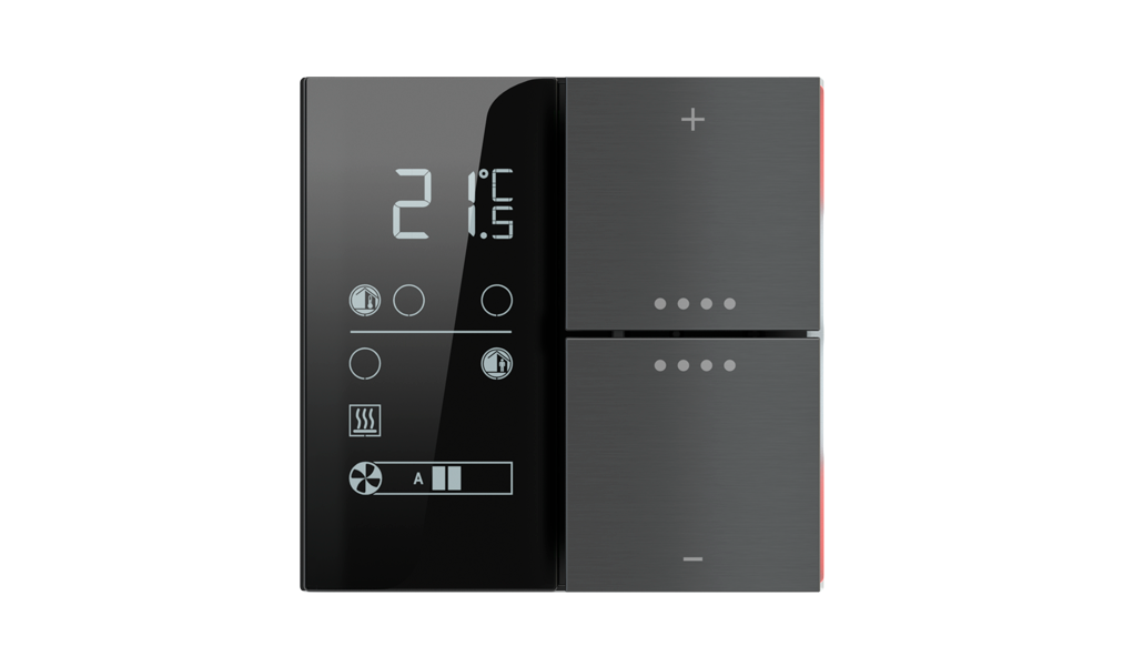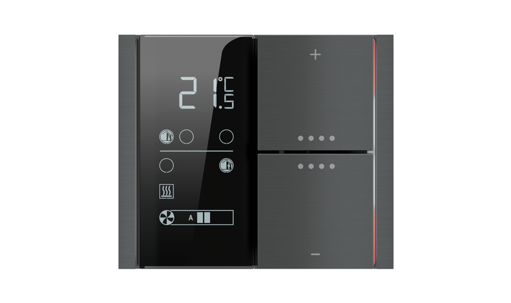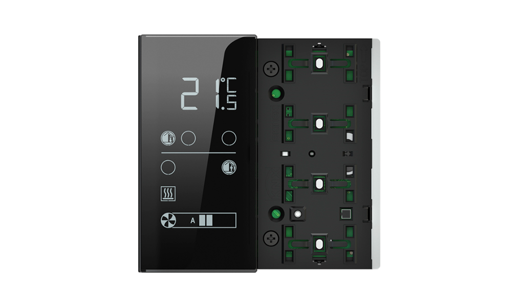 Il termostato ambiente Ekinex® Easy serie ‘FF svolge la funzione di termostato elettronico digitale con interfaccia semplificata per l’utente e per l’integratore di sistema. Il dispositivo pur utilizzando un unico setpoint differenziato per riscaldamento e raffreddamento con unico modo operativo acceso/spento, consente di controllare terminali con uno o due stadi (come radiatori, pannelli radianti a pavimento e soffitto, ecc.) e unità fan-coil con alimentazione idraulica a 2 o 4 tubi. Il prodotto è equipaggiato con un display LCD a retroilluminazione regolabile, un sensore per il rilievo della temperatura in ambiente e due ingressi liberamente configurabili. I LED di segnalazione possono essere a scelta nelle combinazioni di colori blu/verde o bianco/rosso. Il dispositivo dispone di un modulo di comunicazione bus KNX integrato ed è realizzato per montaggio in scatola da incasso a parete; è alimentato per mezzo del bus KNX e non richiede alimentazione ausiliaria.