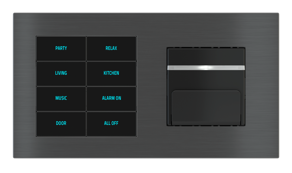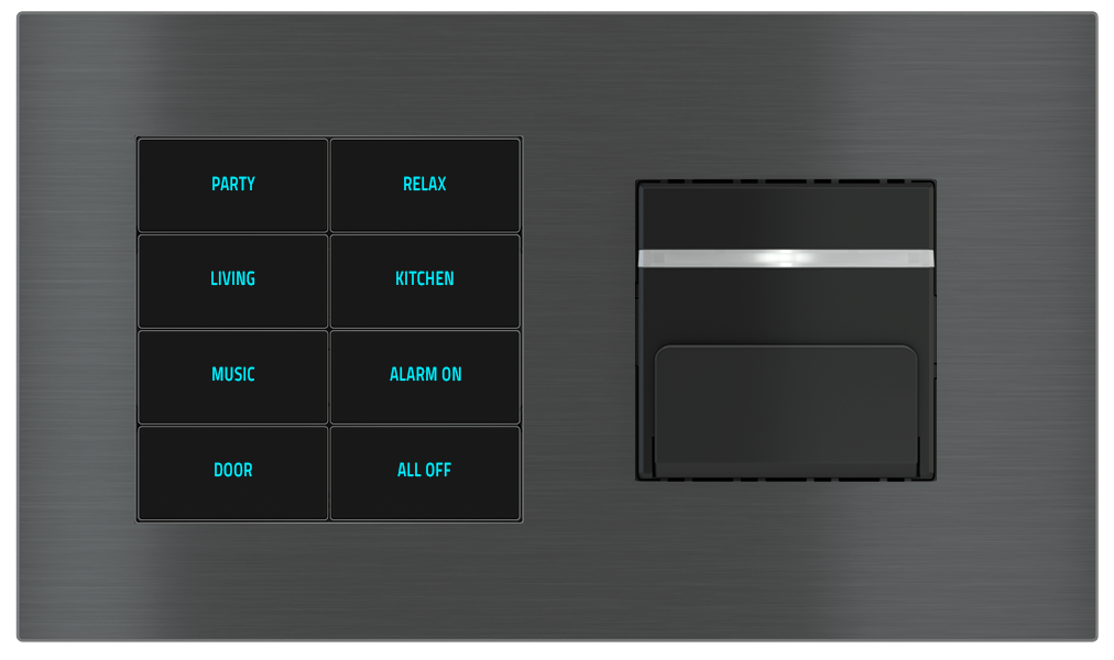 EKINEX Pulsante 8 tasti con testi/simboli retroilluminati, sensore di prossimità e tasca porta-tessere per placca a 2 posti (modulo 60x45 mm)