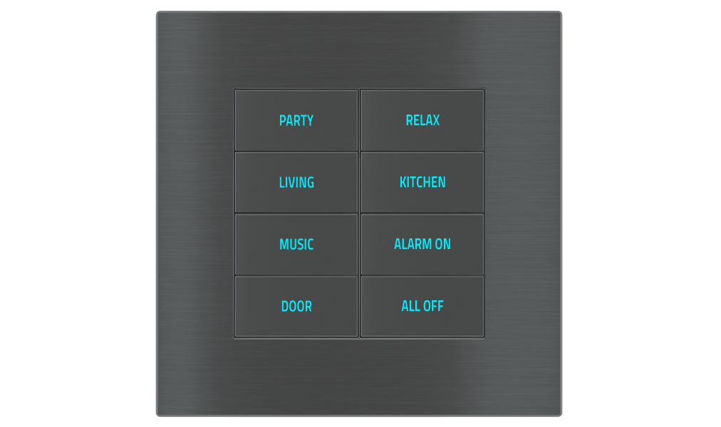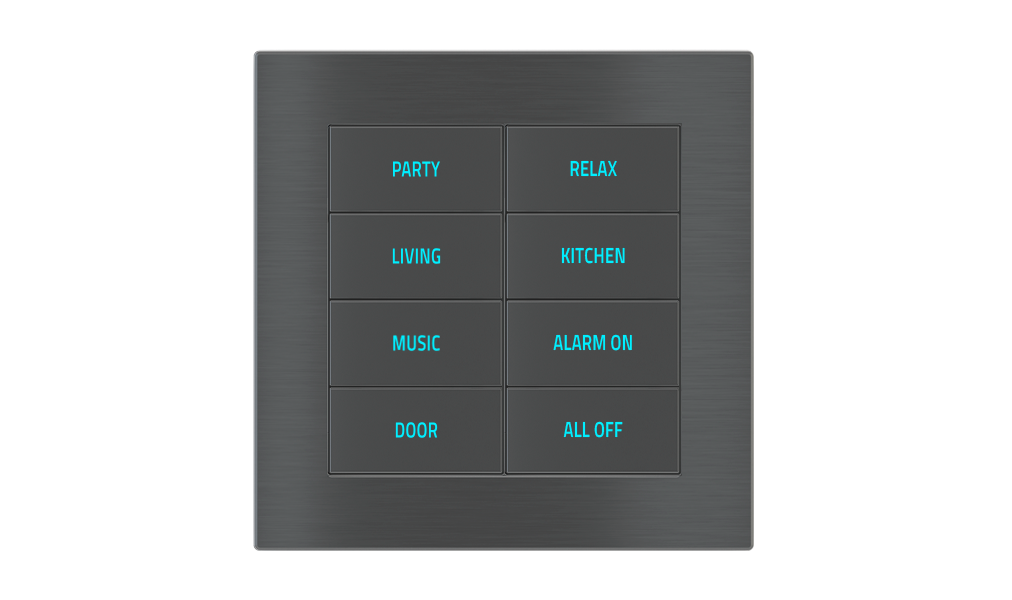 Il pulsante 8 tasti Ekinex® serie 20venti serve al comando on/off di utenze, alla dimmerazione di apparecchi di illuminazione, al controllo di azionamenti motorizzati per tapparelle o ad altre funzioni di comando e controllo programmabili. Grazie al sensore di temperatura integrato, il pulsante può svolgere la funzione di regolatore di temperatura per un ambiente o una zona. LED RGB backlight per ogni tasto. L’apparecchio dispone di un modulo di comunicazione bus KNX integrato ed è realizzato per montaggio in scatola da incasso a parete.
