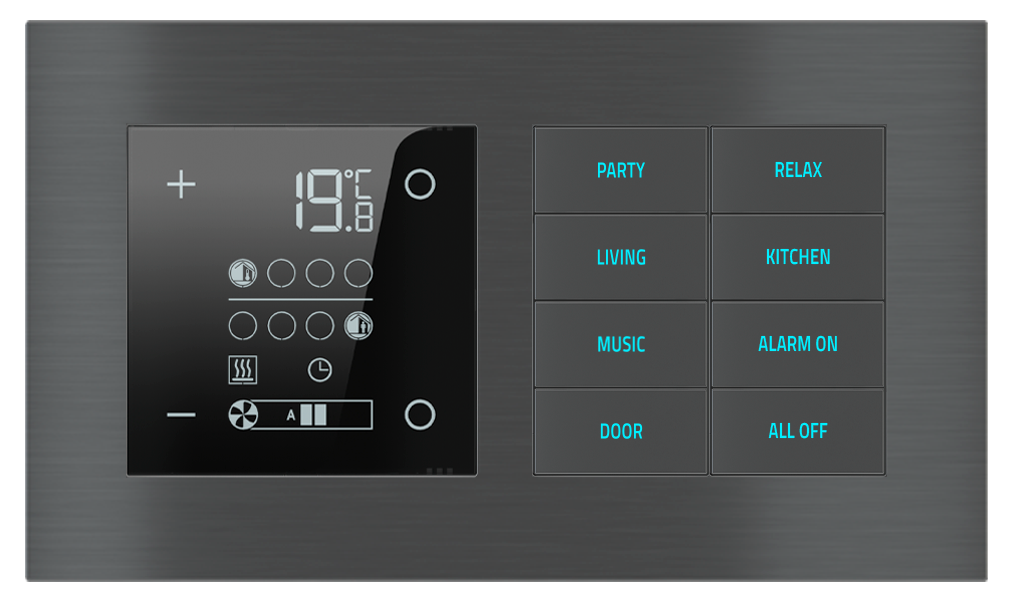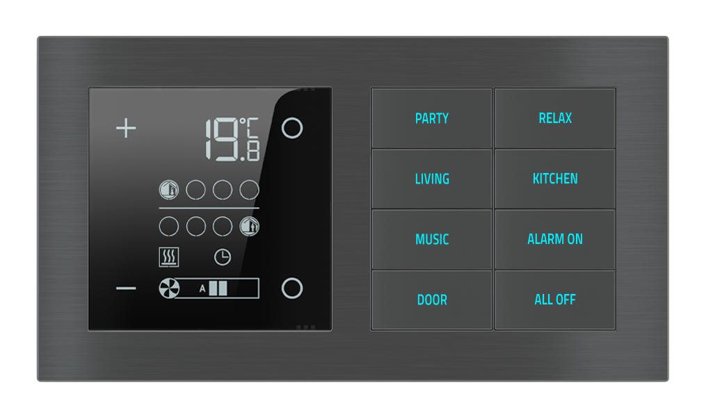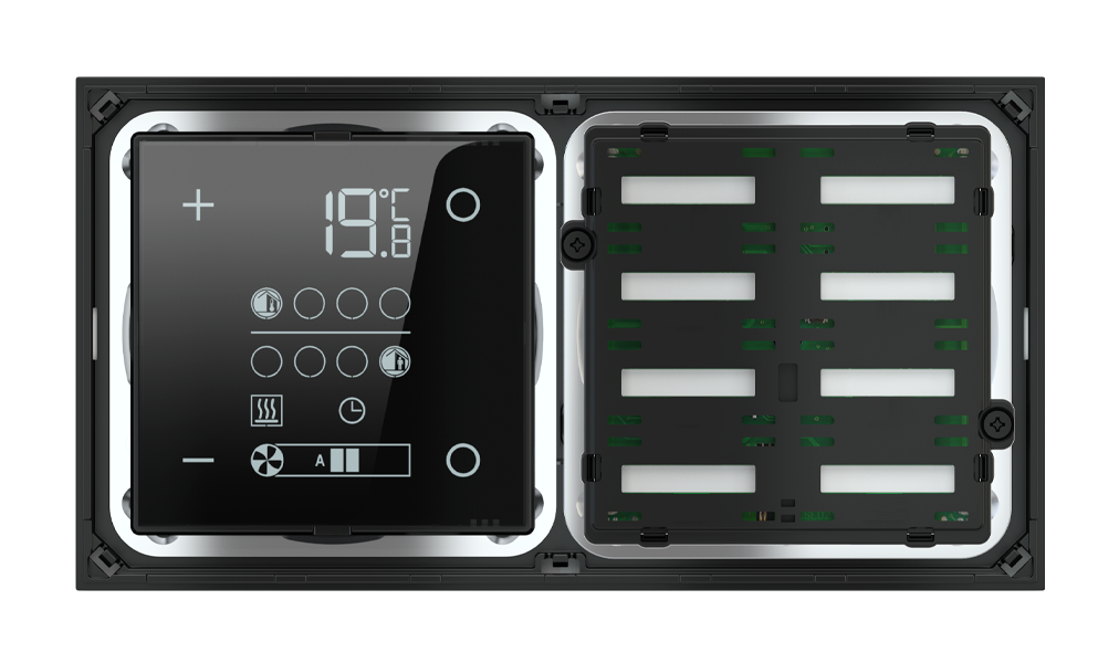 EKINEX Termostato ambiente e pulsante 8 tasti con testi/simboli retroilluminati e sensore di prossimità per placca a 2 posti