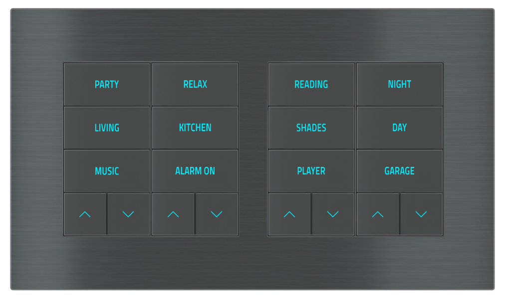- 6 tasti rettangolari da 30 x 15 mm con o senza testi/simboli retroilluminati e 2 tasti rettangolari da 30 x 15 mm in materiale plastico per le regolazioni