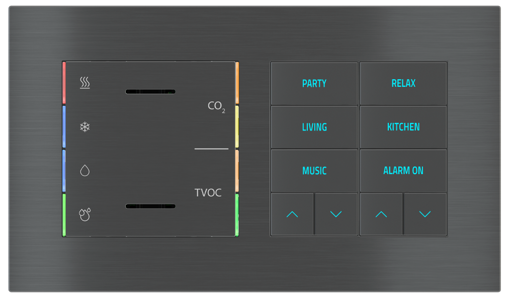 EKINEX Multisensore di qualità dell'aria con regolatore e pulsante 10 tasti con testi/simboli retroilluminati e sensore di prossimità per placca a 2 posti