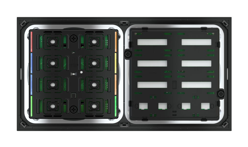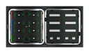 - 6 tasti rettangolari da 30 x 15 mm con o senza testi/simboli retroilluminati e 2 tasti rettangolari da 30 x 15 mm in materiale plastico per le regolazioni
