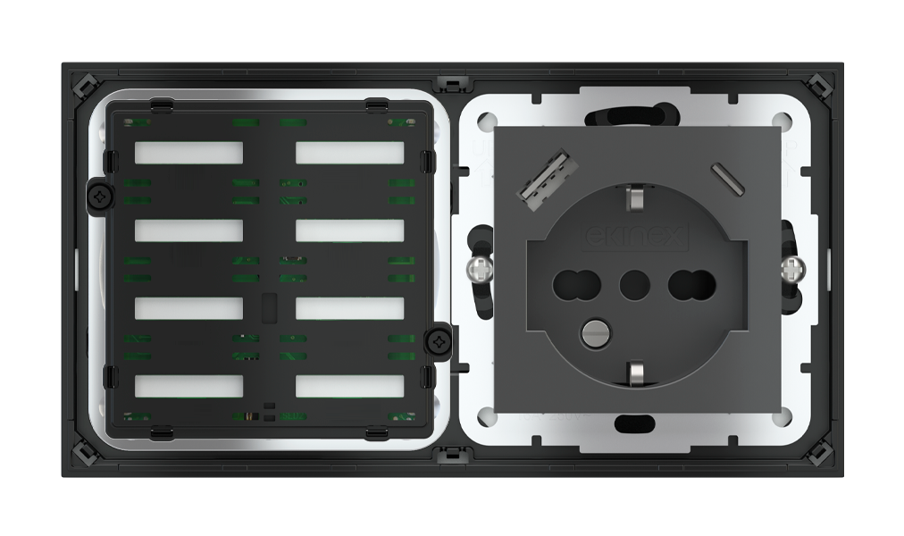 La presa modello Ekinex EK-PWS-IT-USB è un dispositivo per installazione a parete di tipo 2P+T 16 A universale, per eurospine 2P 2,5 A, spine 2P e 2P+T 10 A e 16 A standard italiano, spine 2P+T 16 A standard tedesco, per l’alimentazione di apparecchiature di uso domestico. È dotato di un’unità di alimentazione USB, sia tipo-A che tipo-C, per la ricarica di telefoni cellulari e in generale di tutti gli apparecchi elettronici ricaricabili mediante prese USB del medesimo tipo. È permessa la ricarica di due apparecchi contemporaneamente.