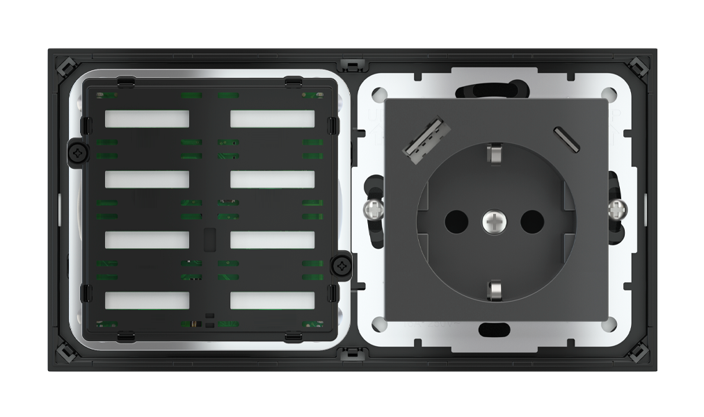 EKINEX Pulsante 8 tasti con testi/simboli retroilluminati, sensore di prossimità e presa elettrica per placca a 2 posti (modulo 60x55 mm) - Schuko USB