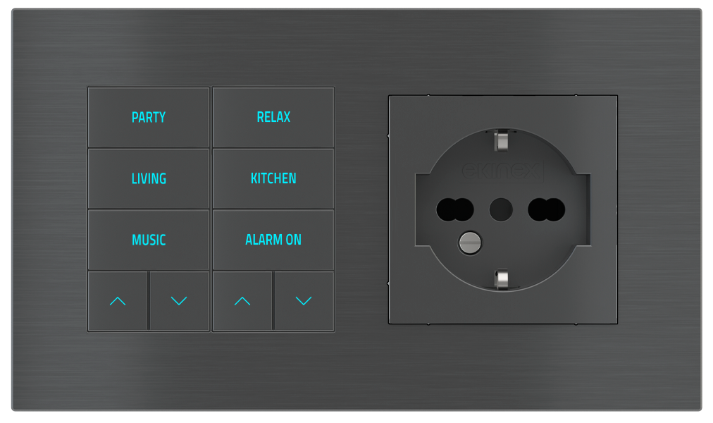 Il pulsante 10 tasti Ekinex® serie 20venti serve al comando on/off di utenze, alla dimmerazione di apparecchi di illuminazione, al controllo di azionamenti motorizzati per tapparelle o ad altre funzioni di comando e controllo programmabili. Grazie al sensore di temperatura integrato, il pulsante può svolgere la funzione di regolatore di temperatura per un ambiente o una zona. LED RGB backlight per ogni tasto. L’apparecchio dispone di un modulo di comunicazione bus KNX integrato ed è realizzato per montaggio in scatola da incasso a parete.