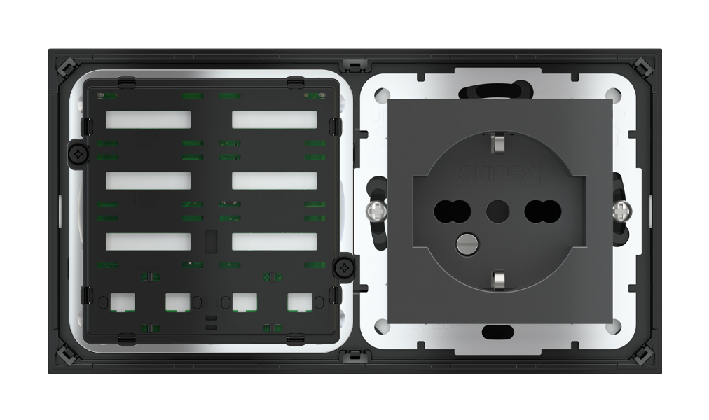 La presa modello Ekinex EK-PWS-IT è un dispositivo per installazione a parete di tipo 2P+T 16 A universale, per eurospine 2P 2,5 A, spine 2P e 2P+T 10 A e 16 A standard italiano, spine 2P+T 16 A standard tedesco, per l’alimentazione di apparecchiature di uso domestico.