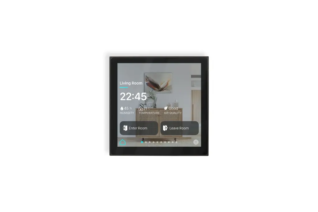 Display 4" KNX - Alimentazione BUS KNX + aliment. ausil. 12-30VDC-Display 4" 480x480 px Dimens. 86x86 x11 mm Sensori T-U- Lux - Pross.-Pagine - 6 -Elementi - 32-Termostati - 4
