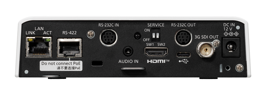Installabile anche a soffitto, MOS da 1/2,8", POE+, ottica zoom 12x, Zoom digitale 1.33x. Messa a fuoco min N/A; messa a fuoco Auto o Manual.Pan/Tilt: orizzontale ±170° (velocità max 100°-200°/s), verticale 30°+90° (max velocità 100°-200°/s). Uscita video 3G-SDI, HDMI, USB, risoluzioni 3840x2160, 1920x1080, 1280x720, 640x360; guadagno manuale o automatico da 0 a +48 dB; velocità shutter da 1/1 a 1/16.000 s. Ingresso audio Mic e Linea. Controllo tramite: protocollo RS-422 (RJ45), RS-232 (mini Din IN+OUT), LAN IP (RJ45), web browser, USB. Numero di preset memorizzabili 100. Temperatura di lavoro da 0° a 40° C. Software opzionale per l'auto tracking AW-SF100/AW-SF200. Alimentatore 12 V DC fornito, PoE+ (42-57V), staffa a soffitto in dotazione. Peso: 1.9 kg. Dimensioni (WxHxD): 165x176x176 mm. Colore: Nero.