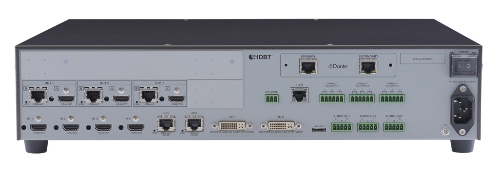 Tri-scaler multi IN digitale-analogico + audio, 3 uscite indipend. selez. HDMI o HDBT, audio OUT DANTE (prim.-sec.). 3 modi operativi: video 2K @60 (3 out attivi); video 4K @30 (2 out attivi 2+1); Multiview (1 out attivo x3). Commutaz. seamless, auto switch, memoria logo, contr. aspect ratio, test pattern generator, contr. EDID video e audio, comp. HDCP 1.4, Anti-snow, Connection reset, contr. totale audio in/out + lip sync + analog audio out. Memorie Crosspoint, Preset, last use. 4 IN-3 OUT HDMI, 2 IN-3 OUT HDBT (supp. PoH), 2 IN DVI-I (digitale, RGB, YPbPr, Y/C, comp.), 8 IN audio digitale + 2 IN-1 OUT audio st, 64 ch OUT DANTE. 1 RS-232, 1 LAN. Switch LAN integrato con HDBaseT. Contr. apparati terze parti con macro RS-232, LAN, CEC, 9 contatti. Pann. frontale: tasti retro illuminati, display VFD, contr. totale da menù navigabile. Controllo: pann. frontale, RS-232, LAN (web). Dimensioni (WxHxD): 430x88x400 mm, 2U mont. Rack fornito. Peso: 7,0 kg. Alimentatore multitensione max 125 W.