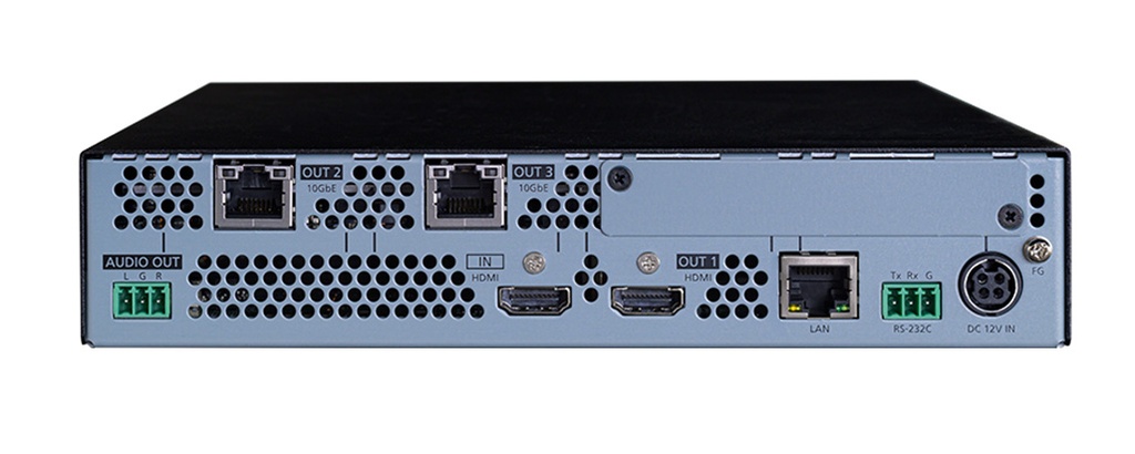Trasmettitore multiplo in standard SDVoE per connessioni punto punto. 1 In HDMI 4K@60 4:4:4, 2 Out CAT 10 GbE + 1 Out HDMI. Risoluzione max per segnali HDMI/DVI 4K @60 4:4:4, supporta HDCP 1.4/2.2. Max distanza SDVoE con cavi CAT6A FTP 100 m (è possibile usarlo ad es. con NJR-L01UC-R). Emulazione EDID, Anti-snow, Connection Reset (solo su HDMI out),controllo via web server avanzato di setup e controllo di tutti i parametri HDMI e SDVoE. Audio de embedder. Segnale HDMI con Dot Clock 25-600 MHz, TMDS clock 25-300 MHz, profondità colore 8, 10 e 12 bit, audio LPCM fino a 8 ch, 3D/ARC/HEC/CEC non sono supportati. Connessioni: 2x HDMI con morsetto di ritenzione cavo, 2x RJ45 per SDVoE 10 GbE, 1x morsetto 3P per audio stereo, 1x morsetto 3P per RS-232 e 1x RJ45 per LAN controllo. Dimensioni (WxHxD): 210x42x300 mm. Alimentatore esterno multitensione out 12 V DC 3 A.