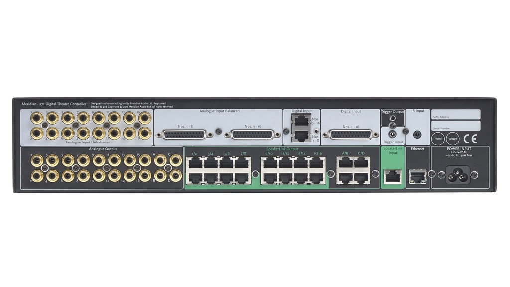 Interfaccia ad alta risoluzione per realizzare sistemi HT con 20 o più canali, interfacciando le uscite analogiche o digitali del processore usato (non Meridian) con i diffusori attivi DSP Meridian. Ingressi: 16x analogici su RCA 16x analogici bilanciati su due connettori DB25 1x SpeakerLink per il pass-through dell'audio digitale a due canali (compatibile con MQA) 1x digitale a 16 canali sul connettore DB25 (per Trinnov) 1x AES-EBU a 16 canali su doppio connettore RJ45 (per Datasat e Storm Audio). Uscite: 20x analogiche su RCA 20x digitali SpeakerLink. Segnali di controllo: via IP per sistemi di controllo di terze parti IR su jack da 3,5 mmDimensioni (AxLxP): 88x440x358 mm (senza piedi). Peso: 5 kg. Costruzione: custodia 2U montabile su rack. PSU: Alimentazione lineare avanzata: 110-120 V ca 50-60 Hz | 220-240 V ca 50-60 Hz
