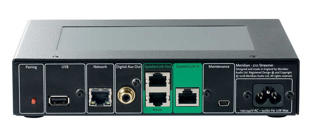 Zona audio Hi-Res, sia con audio locale che distribuito (ingressi ed uscite digitali e analogici). Ingressi: 1x ingresso di rete (Ethernet) per la connessione a servizi di streaming, Sooloos Roon o interfaccia di controllo alternativa. Uscite: 2x Speakerlink 1x co-ax digital aux output (RCA phono) USB input (USB-A connector). Controllo: via IP: presa di rete per l'uso con l'app iPad Meridian IP Control, altra interfaccia di controllo Sooloos, Roon e sistemi di controllo di terze parti via IR su jack da 3,5 mm. Dimensioni (AxLxP): 42x204x150 mm. Peso: Standalone: ?? 0,56 kg. Costruzione: Kit rack 1U disponibile con spazio per due unità Staffa di montaggio universale. PSU: Alimentatore ad alte prestazioni: 100 V ca 50/60 Hz | 110-120 V ca 50/60 Hz | 220-240 V ca 50/60 Hz