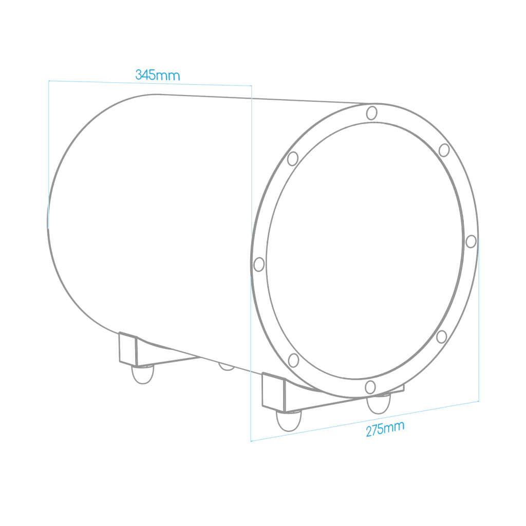 Subwoofer cilindrico amplificato 300 W con controlli di fase a switch 0°-180° e crossover, uscita crossoverata 100 Hz fissa per satelliti. Controlli eq 0, +3, +6 a 25 Hz. Cono da 10" lunga escursione e risposta in frequenza 18-180 Hz. Dimensioni 275x305x345 mm. Garanzia 2 anni.