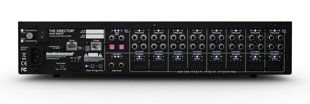 L'amplificatore di potenza del segnale con 16 canali AudioControl Director Model ACP-DMZ-M6800D Matrix garantisce una potenza ad ogni singolo canale di 100 W a 8 ohm, 200 W a 4 ohm e 400 W a 8 ohm con il ponte sui canali. Potenza massima richiesta: 2400 W. Come input local possiede 8x stereo e come input BUS/AUX 2x digital. Come output BUS 2x digital. Garantisce un'S/N RATIO > 98 dB. Questo modello è compatibile con il protocollo di rete Dante e può essere controllato interamente tramite network (TCP/IP), inoltre, essendo DSP permette l'equalizzazione e la variazione di alcuni parametri tramite interfaccia Ethernet (HTTP o Telnet) per la modifica della diffusione sonora a proprio piacere. Questo modello per essere montato nel rack necessita di 2 unità di spazio. Dimensioni: 8.89 x 43.18 (senza staffe rack) x 39.37cm (AxLxP). Peso: 9.6 kg.